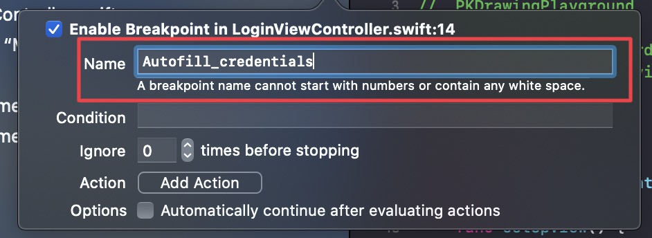 Since Xcode Version 12.0 beta 4, it is also possible to name breakpoints to make it easier to find the one that you want to enable. To do that you only need to provide a name in the new parameter “Name” added to the breakpoints form, and the breakpoint will be listed showing the given name.