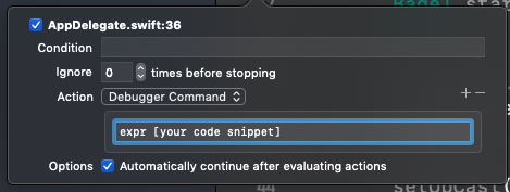 This type of breakpoint, together with the command “expression” of lldb, allows injecting and running arbitrary code that is executed in runtime.