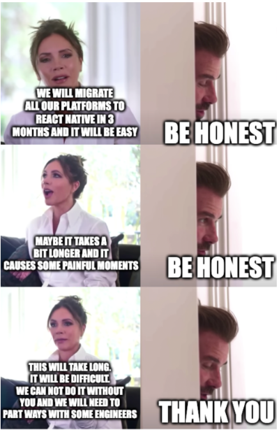 Has this ever happened to you? You start considering a possible migration of your native applications to React Native, and suddenly you are bombarded with hype-filled content promising a development utopia. However, if you share this exciting news with others, it’s very likely that you will receive a lot of hateful feedback in return.